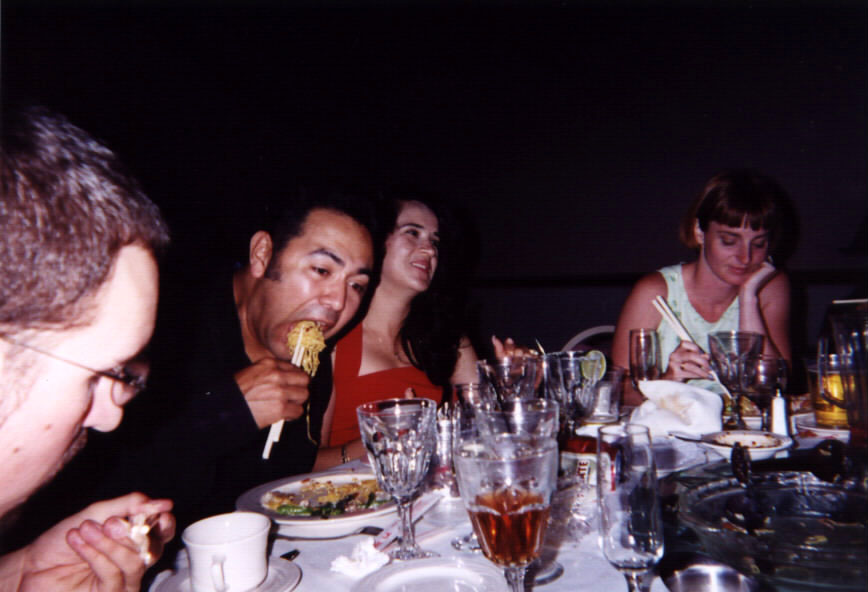 Diana & Kauser Kauser & Roy Erich & Rebecca Nati & Gloria Nati eating noodles with chopsticks |