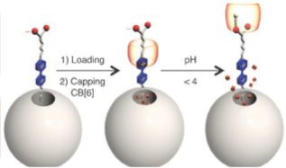 The alkyne-functionalized mesoporous silica nanoparticles are loaded with dye (rhodamine B) molecules, and capped with CB[6]. Cargo is released by switching off the ion–dipole interactions between the CB[6] rings and the bis ammonium stalks upon raising the pH value.